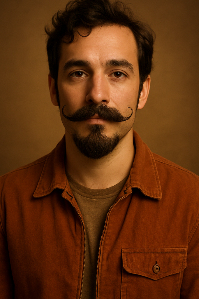 Bold handlebar mustache meets a rounded goateeโthis look is dramatic, intentional, and oozes creative energy.
