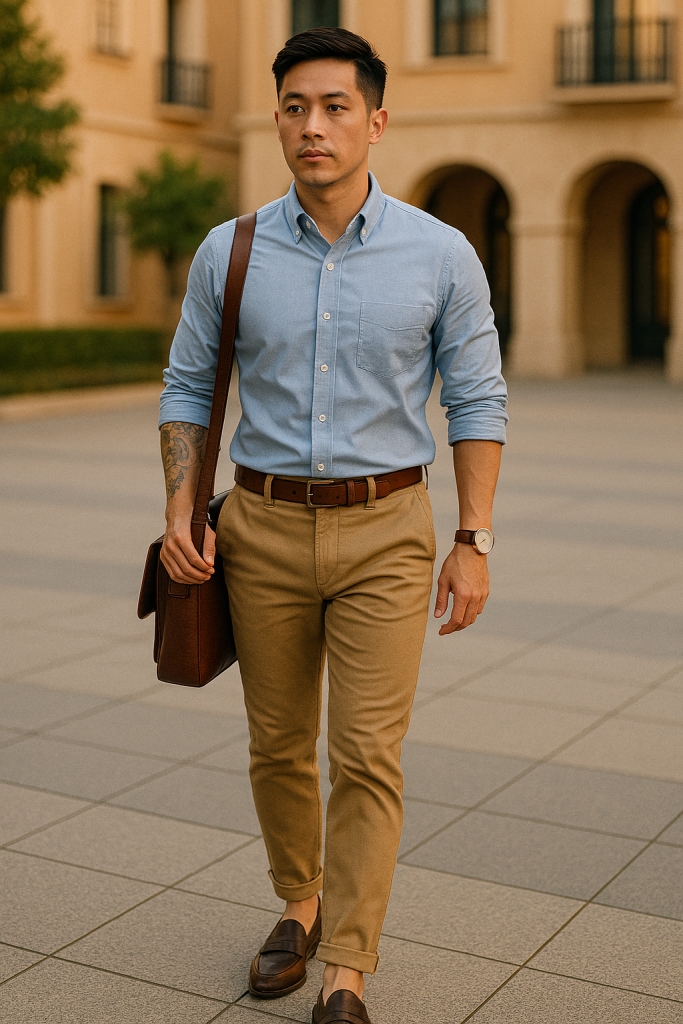 Try this: Tan chinos, a light blue Oxford shirt, brown leather belt, and suede loafers. Perfect for casual Fridays or networking events.