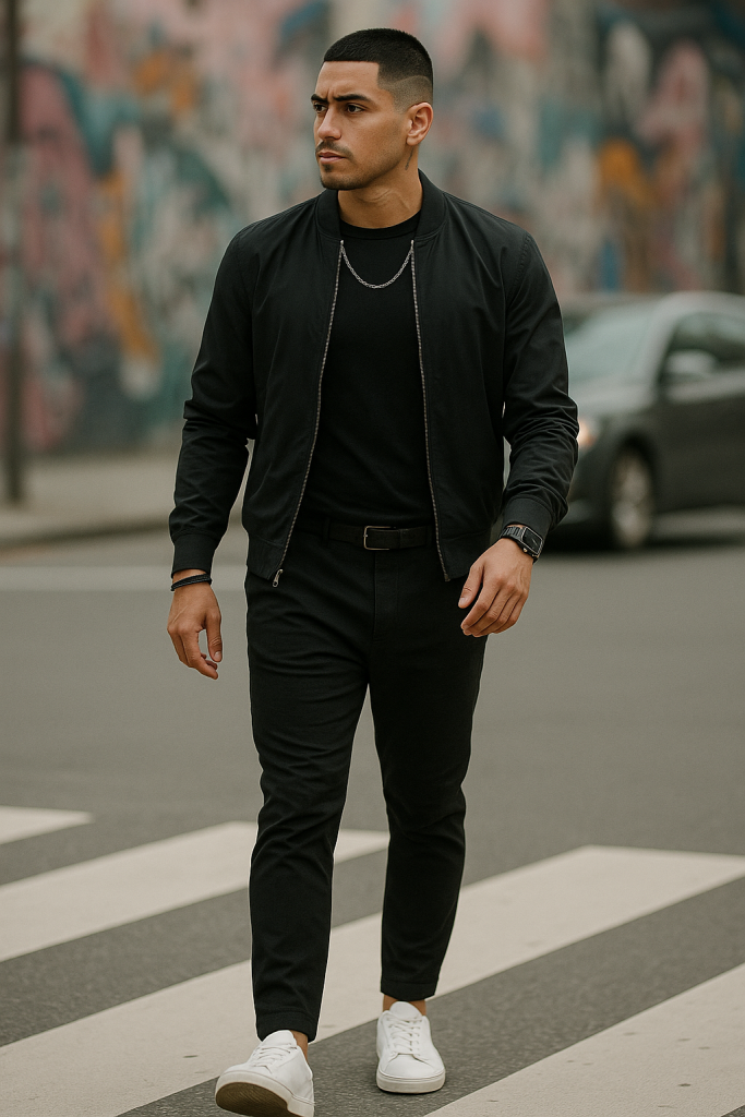 Look Example: Black slim joggers, white sneakers, fitted long-sleeve tee, and a minimalist bomber jacket.