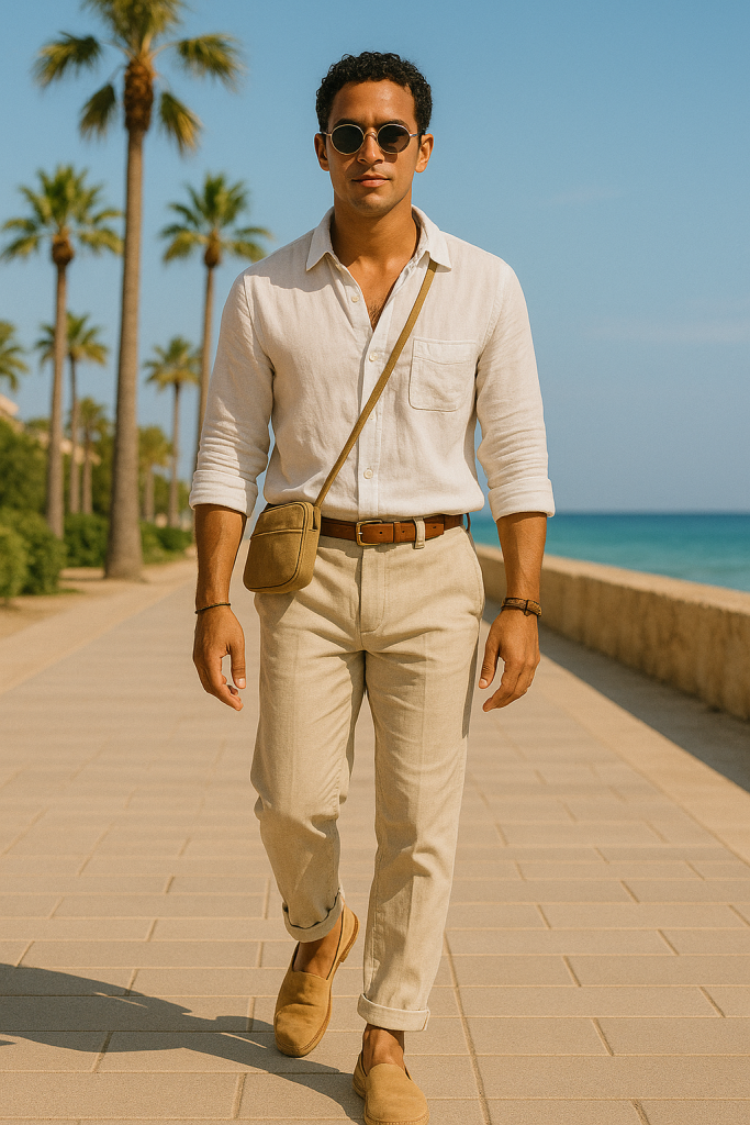 Light colors, breathable fabrics, and relaxed tailoring rule summer. Linen shirts, cuffed chinos, and loafers or espadrilles are your go-to.