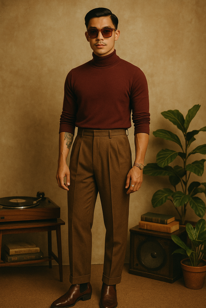 Vintage is always in. Pull inspiration from ‘60s and ‘70s styles — fitted turtlenecks, pleated pants, or Cuban-collared shirts.