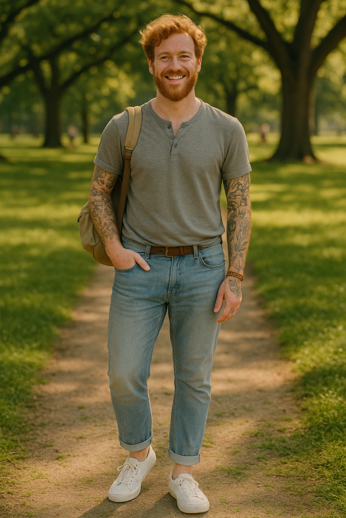 Easy Outfit: Henley shirt + light wash jeans + canvas sneakers = effortless.
