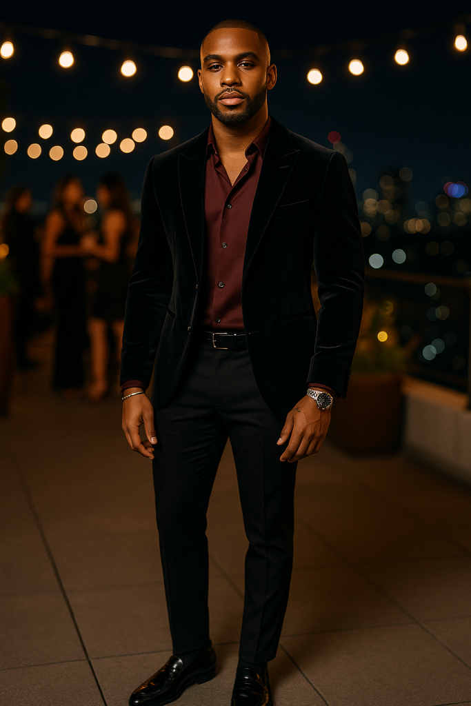 Try This: Black fitted shirt + slim trousers + velvet blazer = red carpet ready.