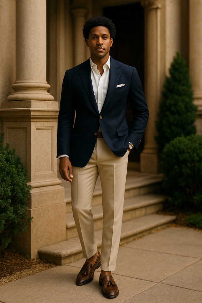 Look Suggestion: Navy blazer, white shirt, beige chinos, brown loafers.