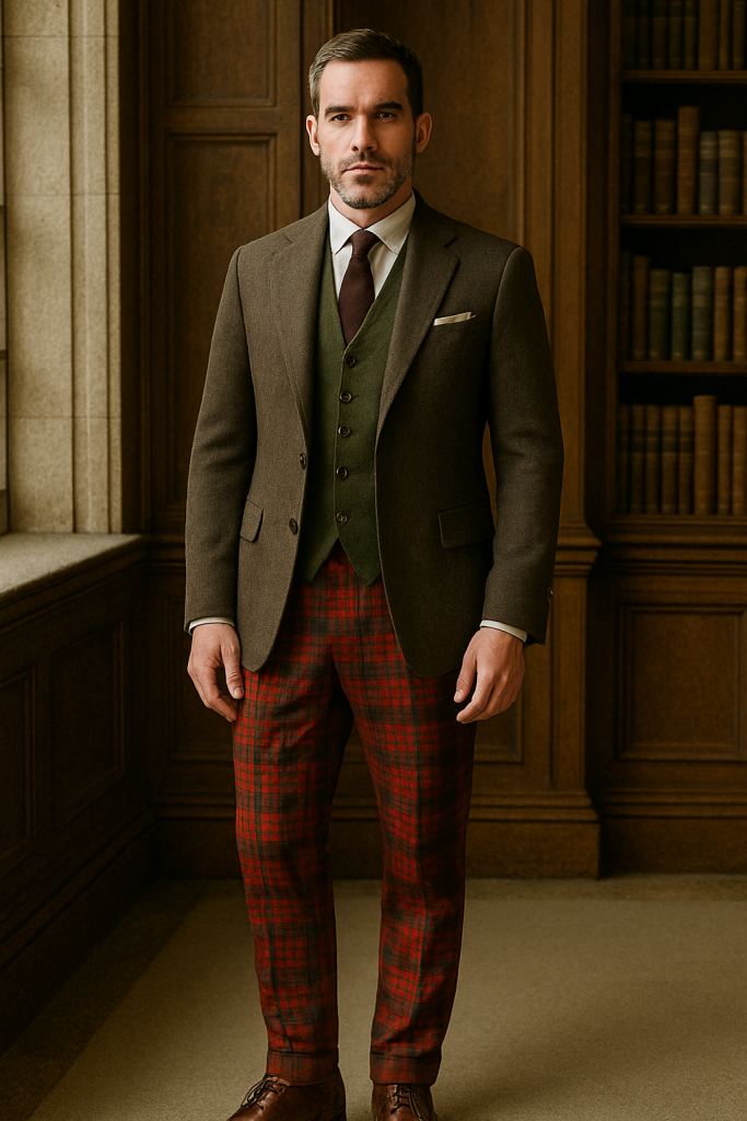 Red plaid trousers scream ancient land titles, not shopping malls. Paired with a mossy wool vest draped across wide aristocratic shoulders. Oxford brogues scuffed just enough for pedigree. Pocket square peeks like an heirloom whispering from granddad’s manor coat.
