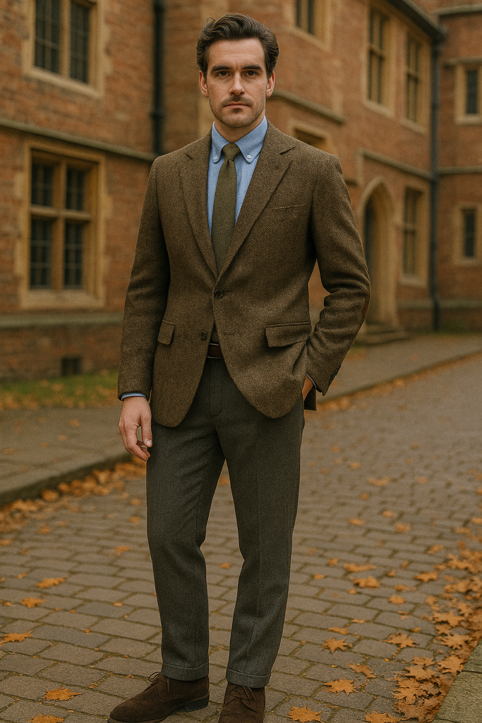 Herringbone tweed jacket with suede elbow patches over a button-down oxford shirt. A muted tie and wool trousers say “academic legacy.” Leather satchel slung over one shoulder seals the look.