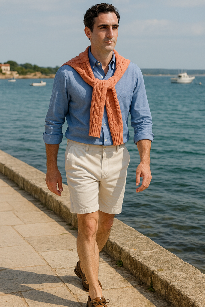 A salmon-colored cable knit draped over the shoulders of a sea-blue button-down. White chino shorts cuffed just right. Worn boat shoes and a navy canvas belt.