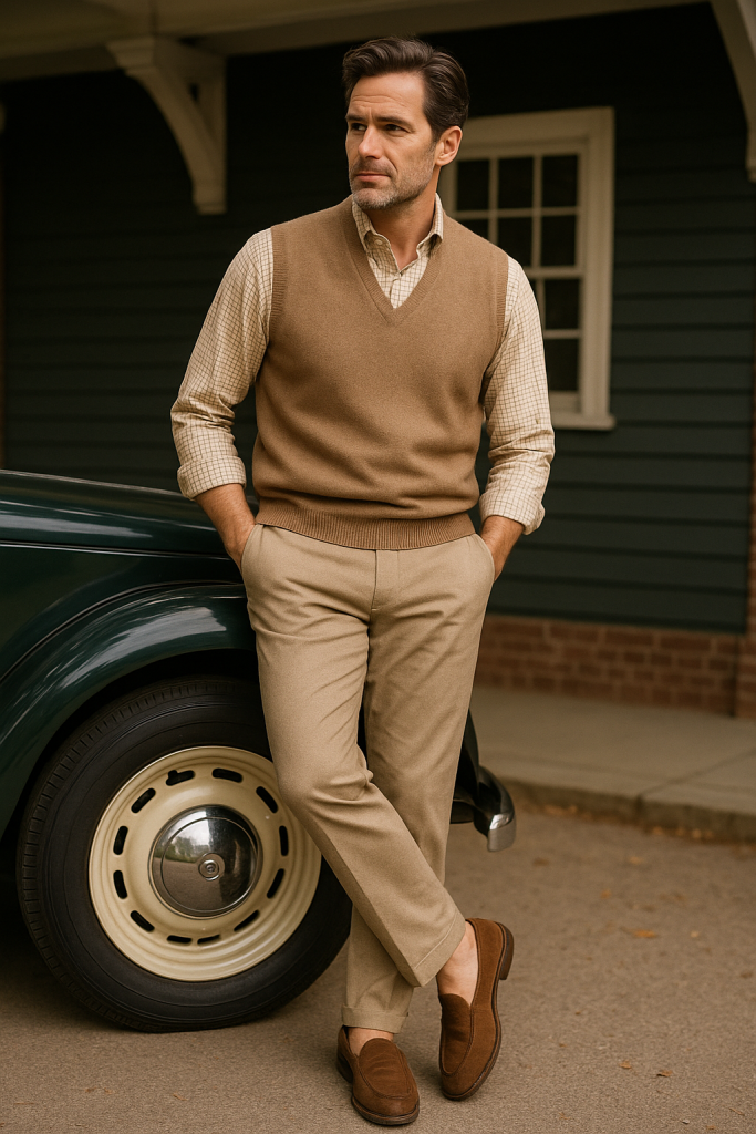 Cashmere vest over a check shirt, tucked neatly into beige slacks. A worn leather belt that’s outlived at least three clubs. Loafers with visible wear and charm.