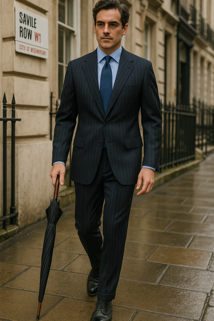 Pinstripe suit with a touch of softness, like it’s been hanging in a cedar closet for years. Sky-blue shirt and silk tie with a subtle print. Umbrella in hand, not for rain—just tradition.