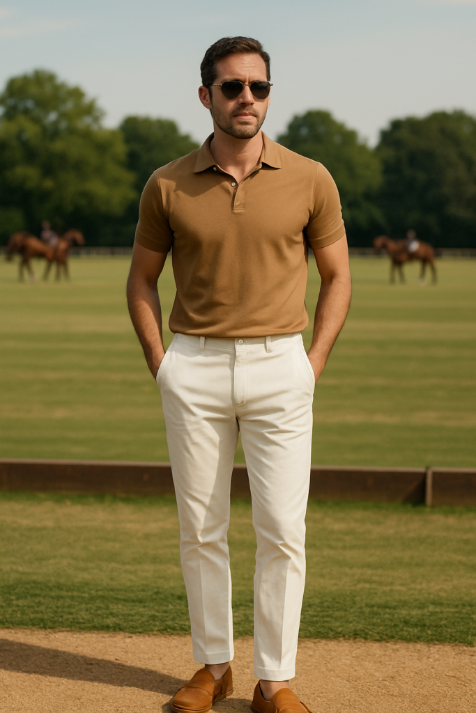 Slim white trousers with a tan polo tucked in. Light belt, loafers, and a hint of cologne. Aviator sunglasses push this into summer aristocracy.