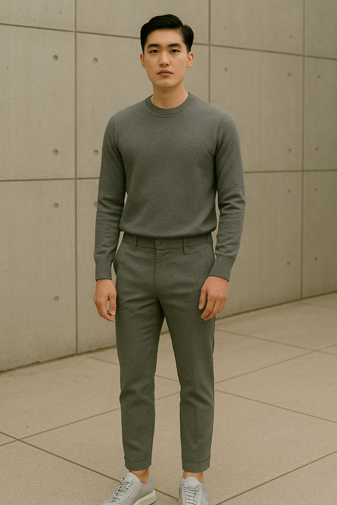 - Beige or gray fitted crewneck