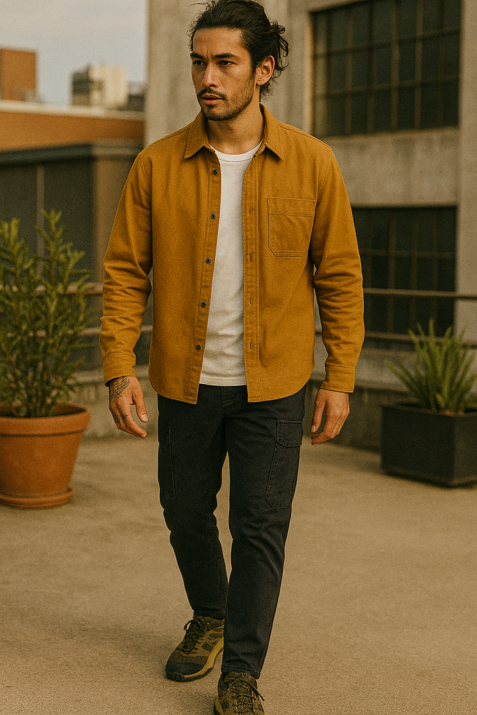 - Cotton overshirt (in mustard, navy, or forest green)