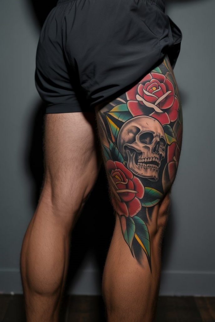This combo takes the classic skull and rose design but gives it a modern twist with vibrant colors and bold outlines. The area behind the knee isn’t the easiest, but it’s a high-impact canvas that makes people look twice.