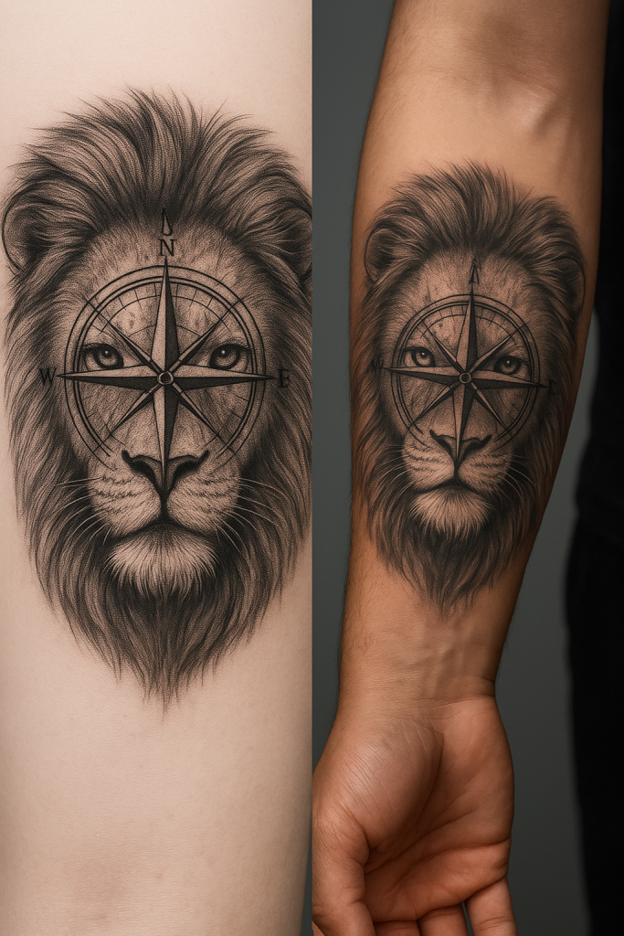 Symbolizing guidance and strength, this tattoo combines a detailed lion head with a compass pointing true north.