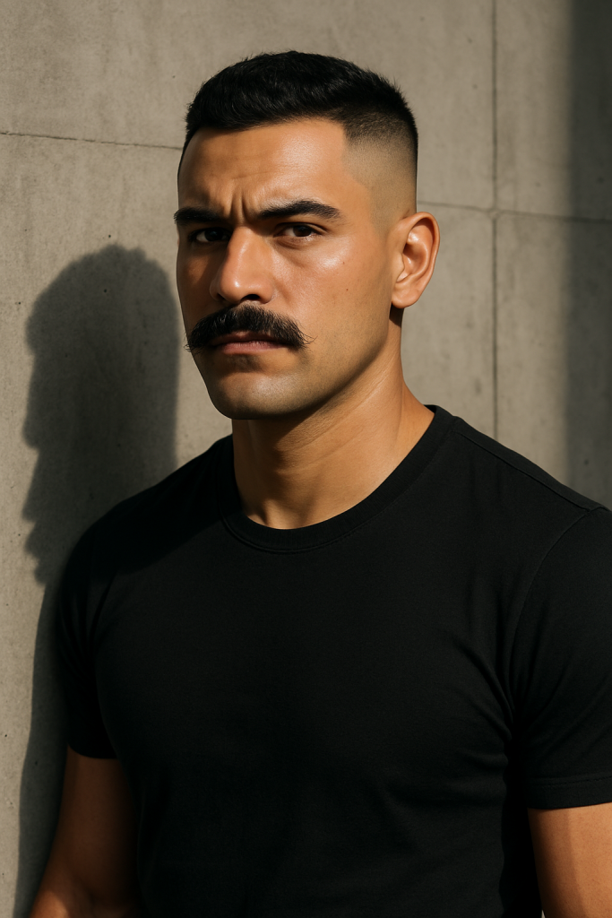 The Confident Commander pairs a high skin fade with a thick, chevron mustache that commands attention. The fade is tight and precise, drawing the eyes directly to the bold facial hair.