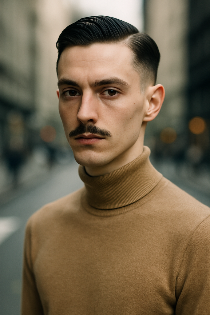 The Euro Minimalist is a stylish low fade paired with a thin, pencil mustache. It gives off a sharp, continental vibe that feels effortless and artsy.