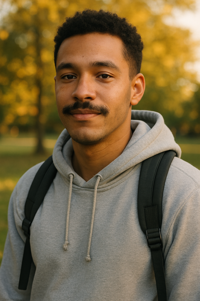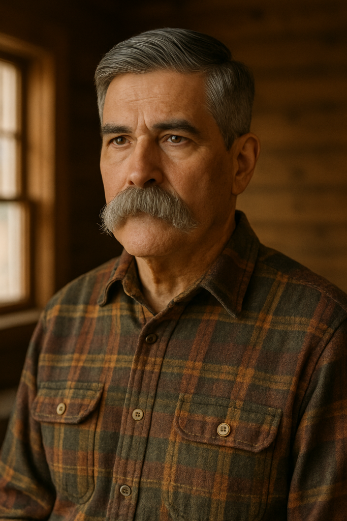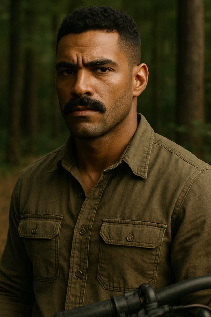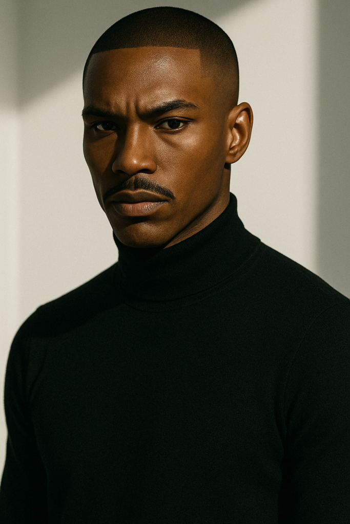 The Rugged Minimalist blends a classic fade with a thick mustache and light stubble—great for men who don’t want a full beard but still want facial hair edge.