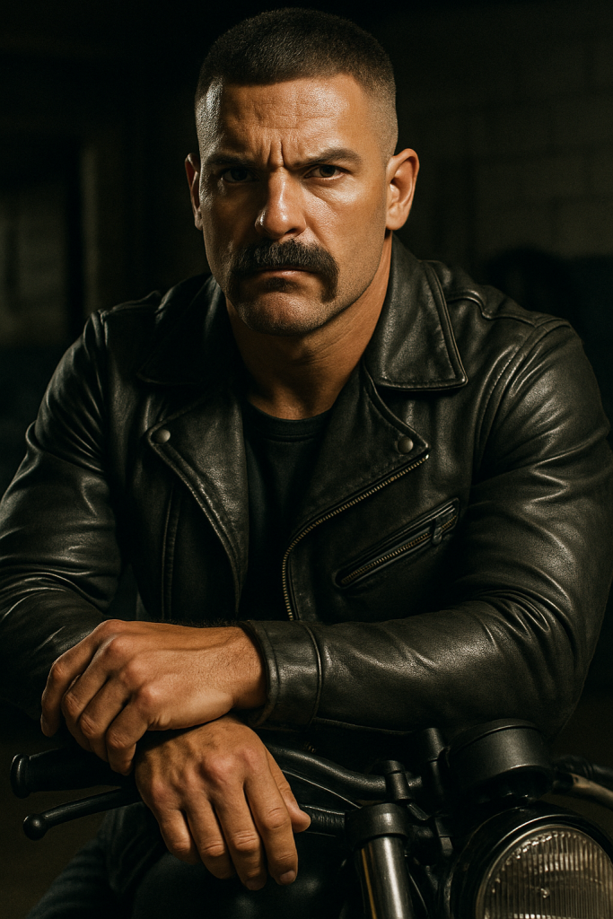 The Rebel Biker is all attitude: a temple fade paired with a thick, horseshoe mustache that screams confidence.