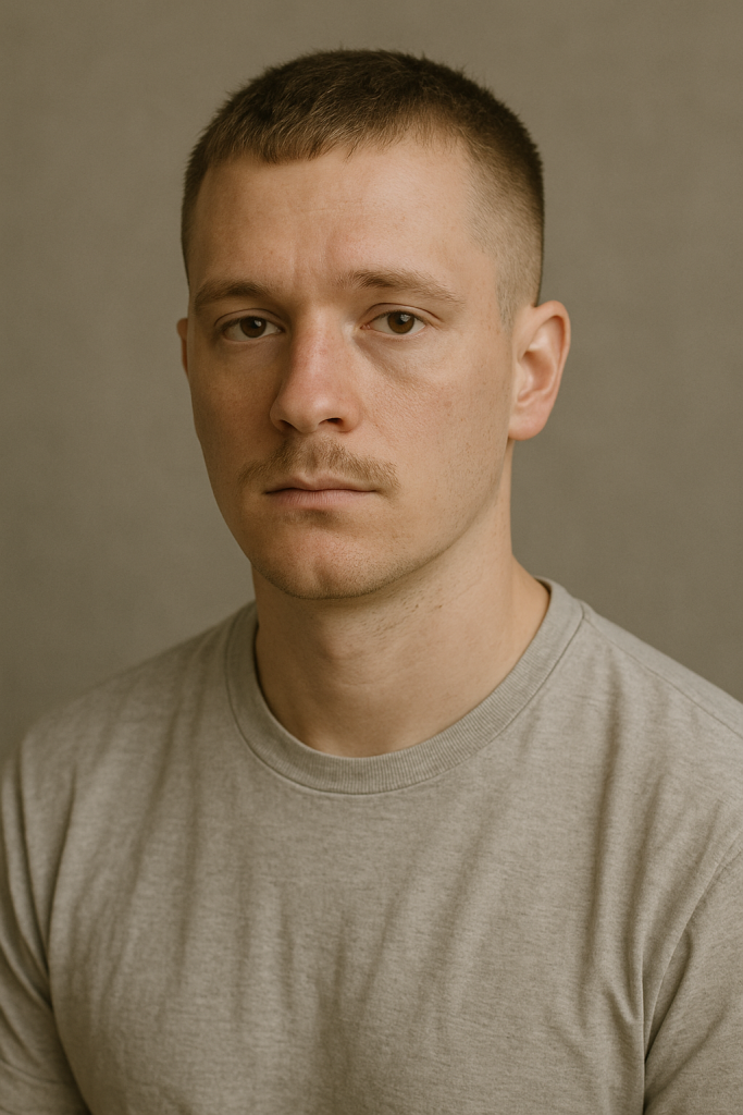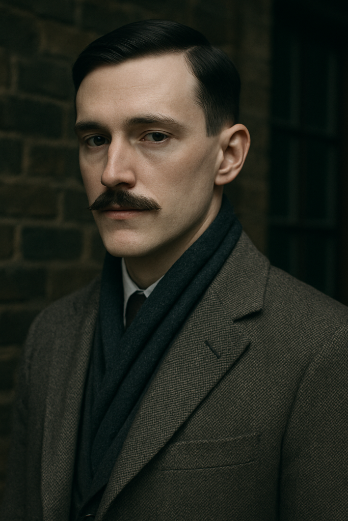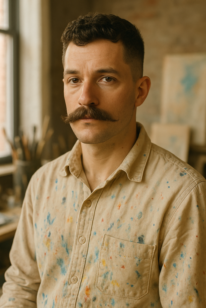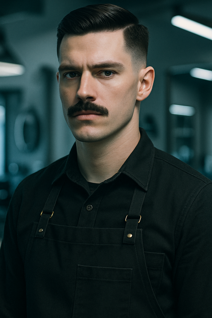 The Precision Craftsman is clean and geometric—featuring a taper fade and boxy mustache trimmed at right angles.