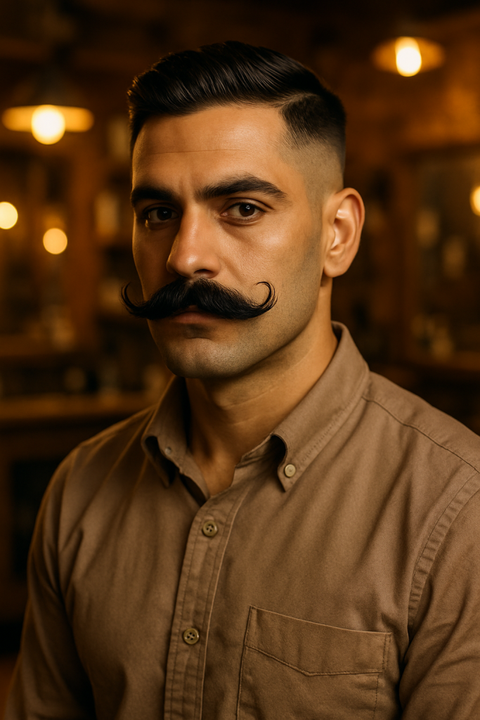 This look works well for men with angular features or strong cheekbones. The chevron mustache adds depth to the upper lip and balances the aggressive fade.