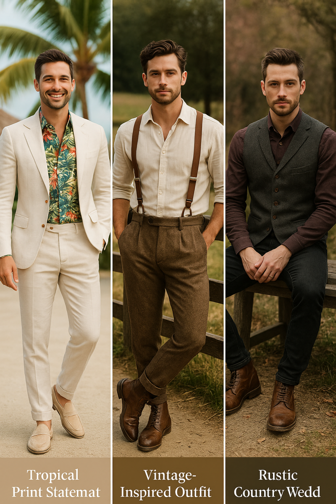 Great for themed or countryside weddings. Add a flat cap or vintage watch for extra flair. Make sure pieces are modern in fit to avoid looking costume-like.